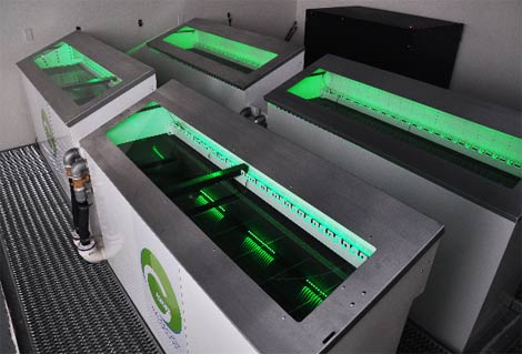 高热密度制冷专家Green Revolution Cooling提出了一种颠覆式的冷却系统方案。该冷却系统要求将机柜平衡放倒在地,然后倒入250 加仑的电介质液体,将服务器垂直插入周围的槽体内,并由连接到商用蒸发式冷却塔上的热交换器来控制液体的温度。该液体容器是由3英寸厚的角钢制成,每个容器里都装有液体液位检测传感器,冷却液体水位反生变化时会立即报警。